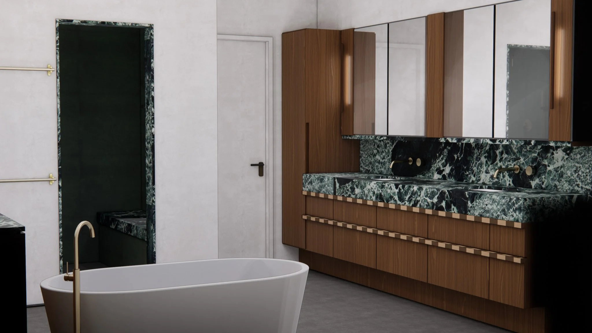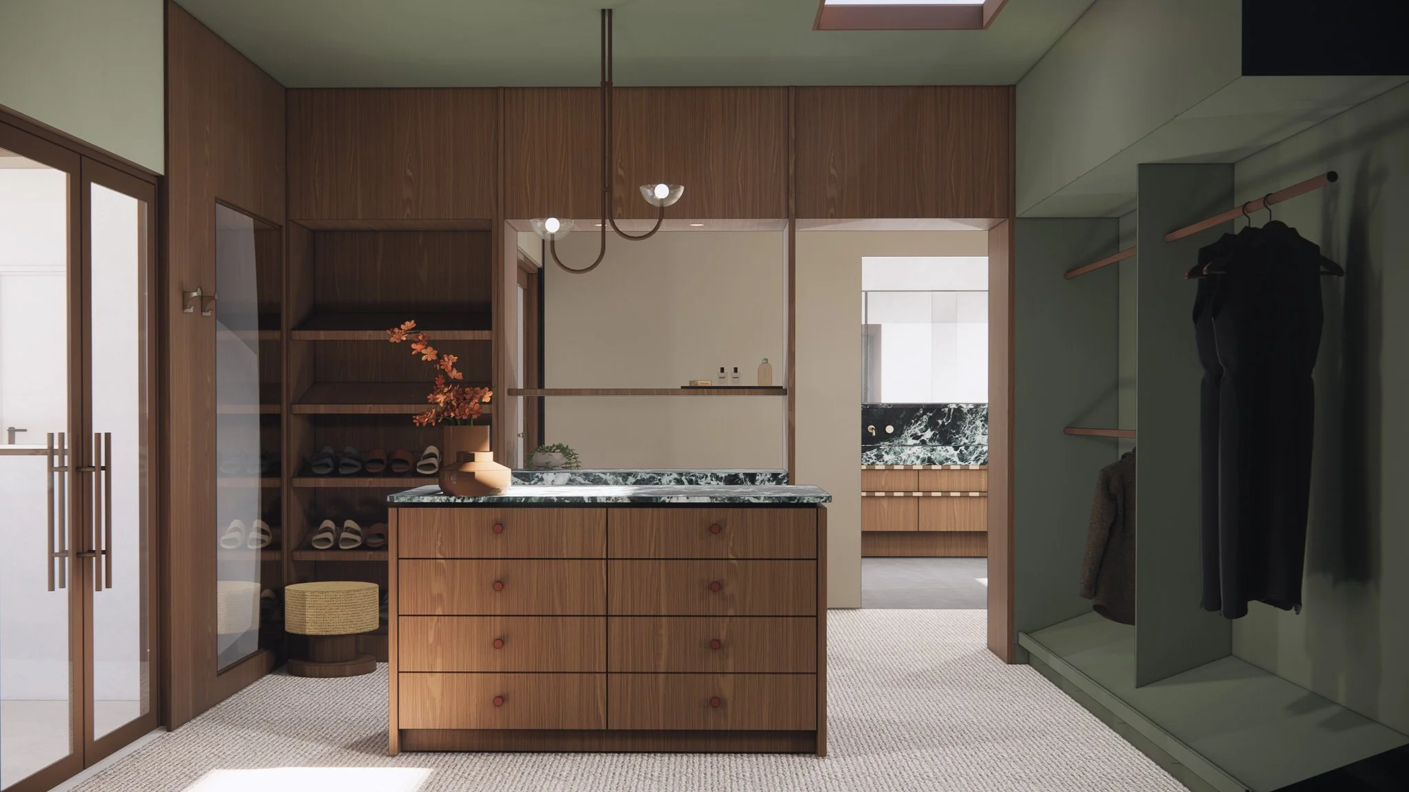 This project showcases striking materiality and bold colour blocking, reflecting the clients’ fearless design vision. Rich natural stones form a captivating foundation, paired with deep walnut timbers and lush forest green accents that add depth and warmth. Complemented by cedar cladding, these materials work harmoniously to create a home that feels grounded in nature while exuding a bold, contemporary edge. The result is a space that’s both distinctive and inviting, perfectly tailored to the client’s adventurous and refined style.