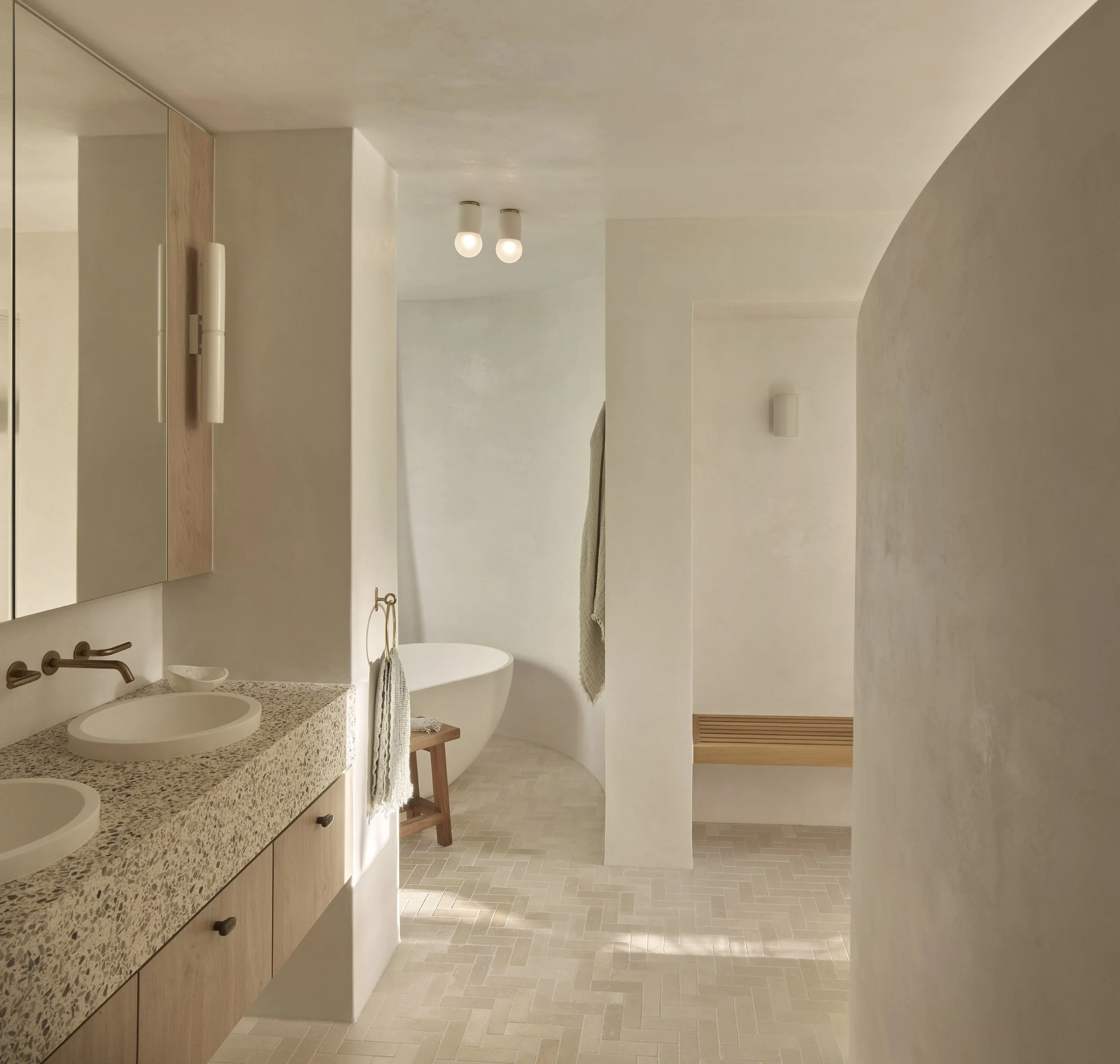 Throughout, we let materials do the talking. Walls were rendered in lime plaster for a natural, clouded softness that shifts with the day. Solid European oak doors punctuate the interiors with warmth and weight, while natural limestone floors stretch underfoot, cool, honest, enduring. Stone and quartzite surfaces in soft, earthy tones echo the lakeside setting, inviting touch and grounding the home in its environment.