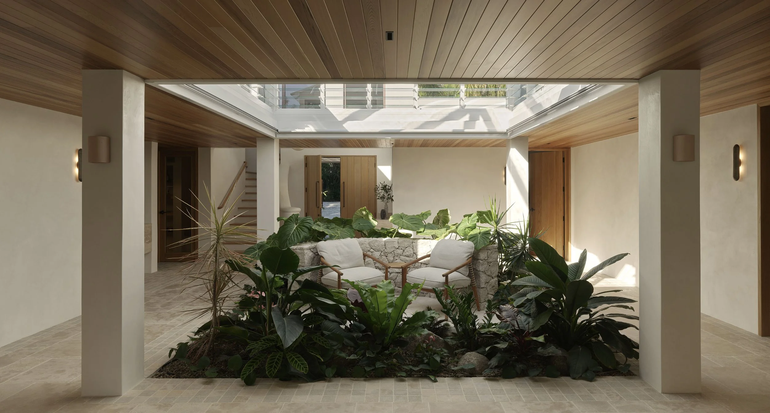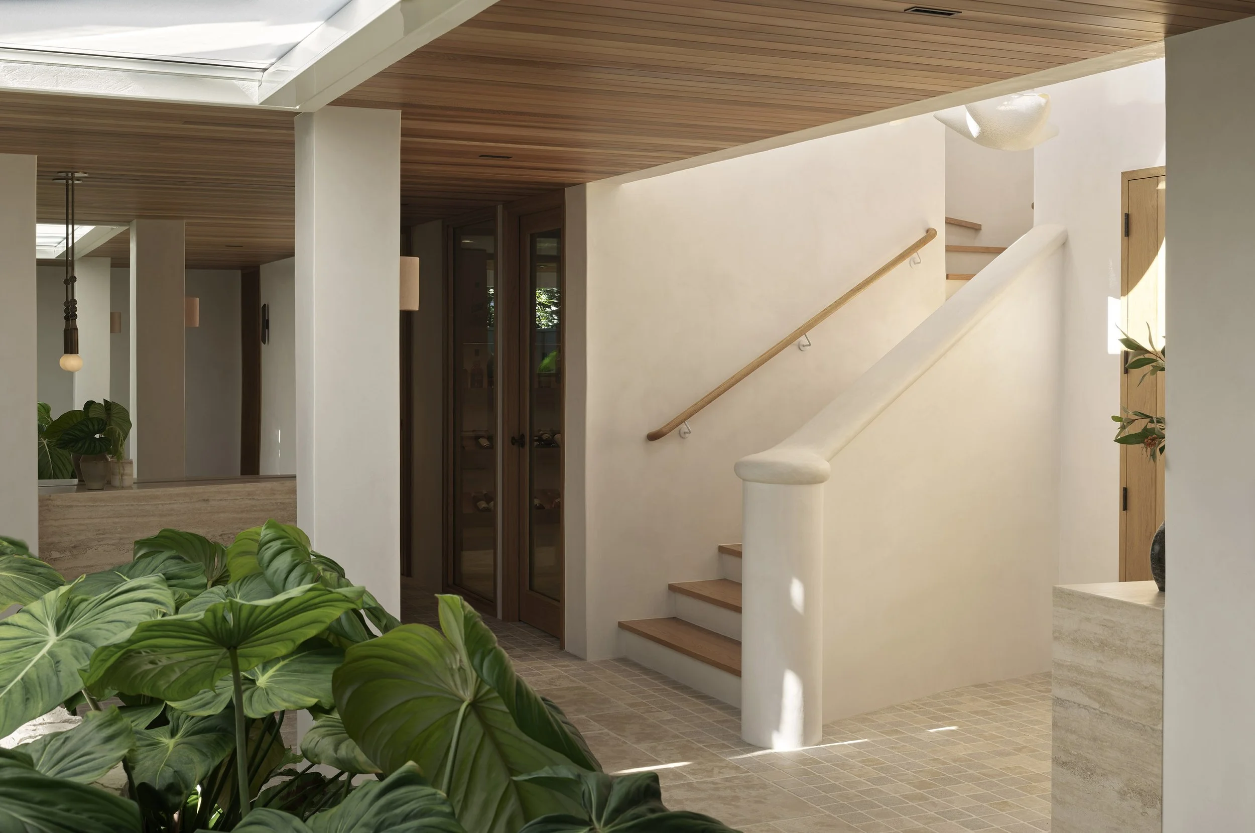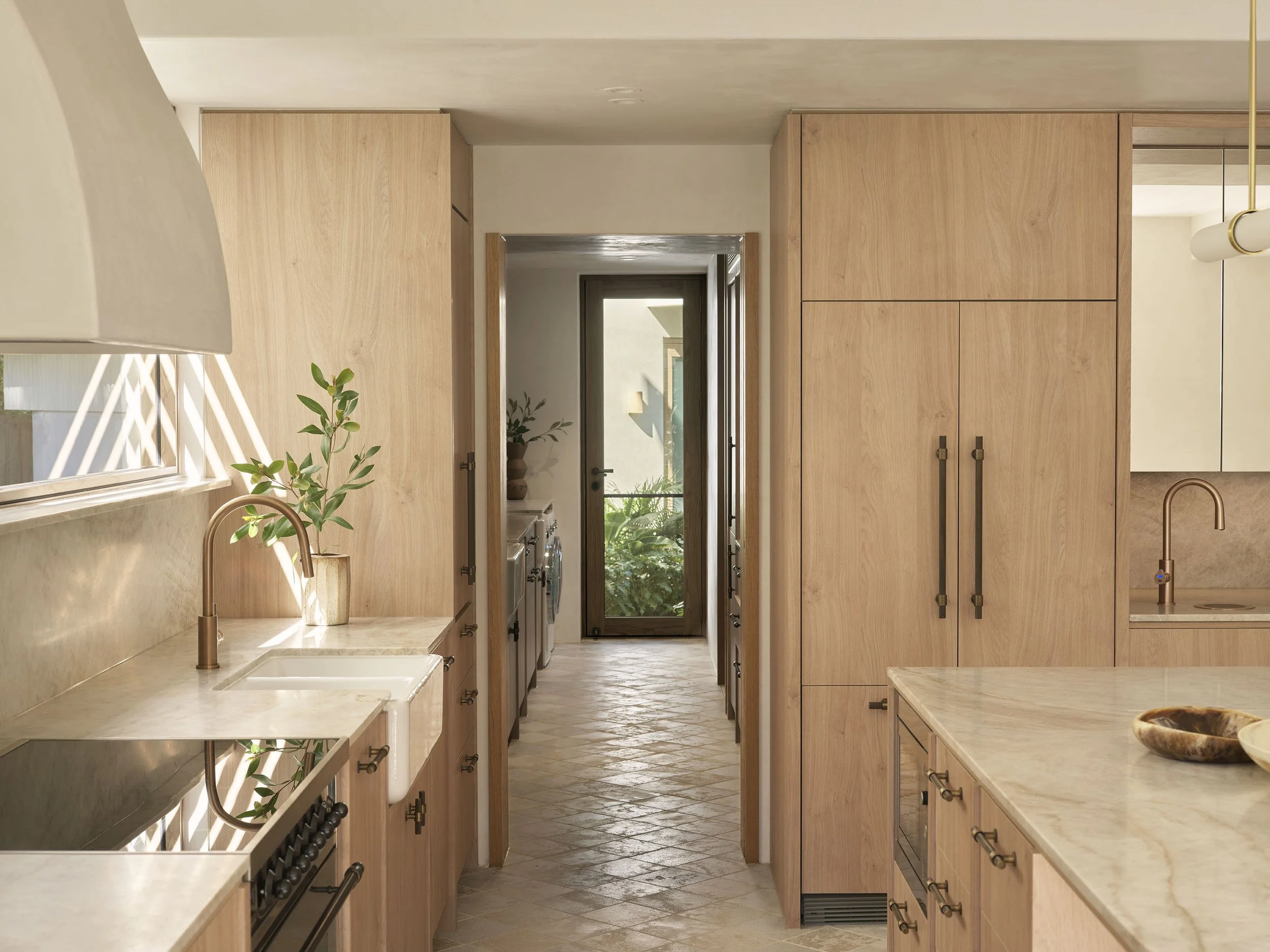 The renovation involved subtle but significant shifts. A kitchen extension allowed for a more generous heart to the home, while the guest house was reoriented and connected to the main residence by a covered breezeway, a light-filled threshold that dissolves the line between indoors and out. Inside, the spatial language was rebalanced for ease and flow, allowing the architecture to breathe and the landscape to anchor every view.