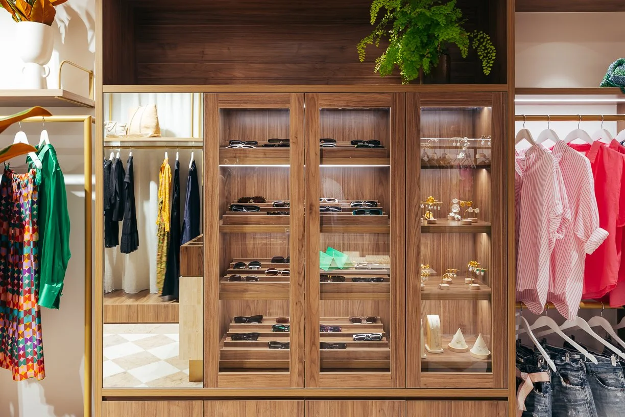 We really enjoyed being involved in the design of both projects, brainstorming ideas and exploring Renegade’s vast library of fabric and finishes. The retail space renovation was particularly challenging for the team with every sqm. of space on ground level and above taken into consideration and utilized for display and storage. From the amount of shoe boxes, pairs of sunglasses, number of hangers, size of the carry bags and tissue paper, nothing was a problem for the team. Renegade’s design aesthetic is unique to them. We loved how they challenged what we originally had in mind for the store and came up with something original. Some of our favourite design elements in the store are the travertine mini flute tiles, the sustainable cork flooring, the powder coated brass trims, the walnut cabinetry, cedar cladded ceiling, handmade wall sculptures and Australian made Marz Designs pendant lights.