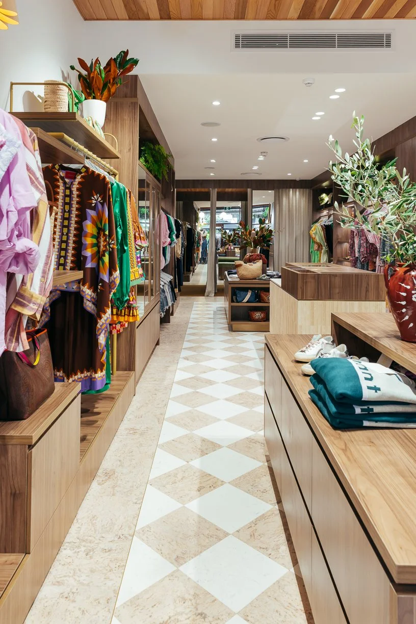 As importers of high-end women’s fashion, the brief was to create a unique destination store reflecting the luxury brands inside whist keeping the relaxed sophistication of Noosa in mind. We started with a 30-year-old stark white interior with an outdated tile floor and wanted to inject warmth and feature lighting to highlight the designs.